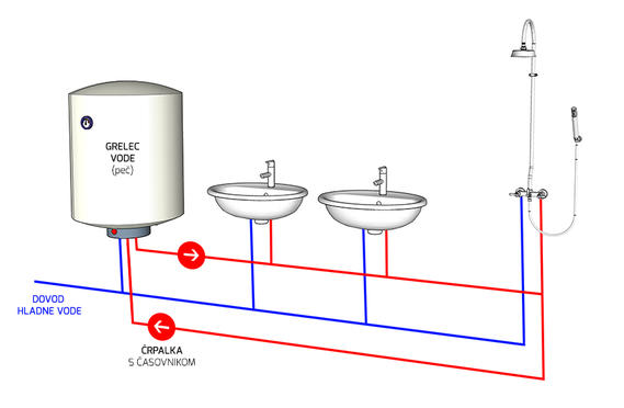 Poskrbite za zanesljiv in hiter dotok tople vode, zato priporočamo izvedbo cirkulacije! Izpeljati je potrebno zanko, v kateri neprestano kroži topla voda in teče v bližini porabnikov. Ko odpremo toplo vodo na porabniku, je tako pot tople vode kratka. V nasprotnem primeru mora topla voda opraviti dolgo pot po instalaciji, da pride do porabnika, kar lahko traja tudi do 1 minuto.